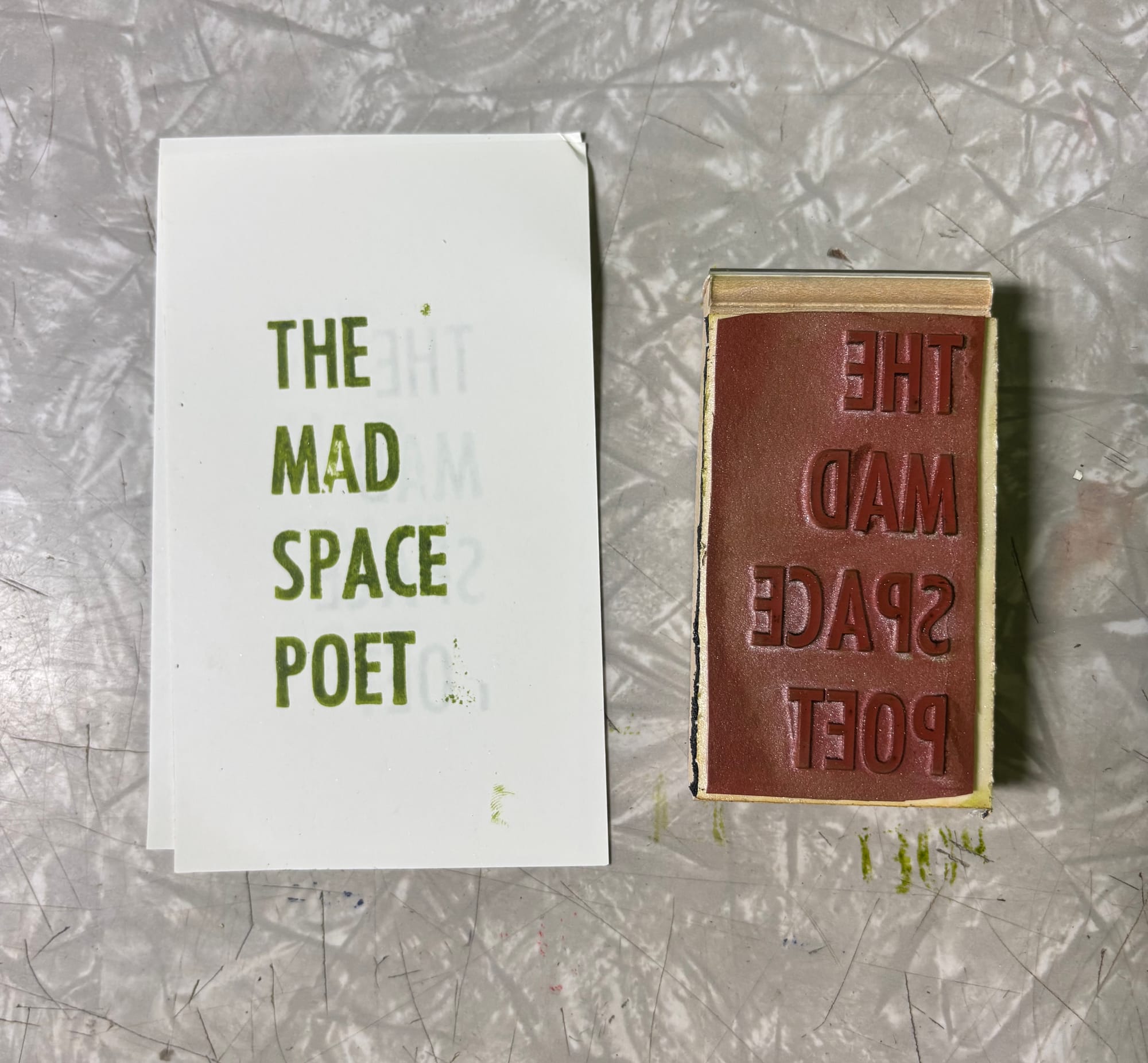 Created a stamp for my brother-in-beard, the Mad Space Poet. The "A" in "MAD" turned out to be a little low, but it adds a nice imperfect touch!