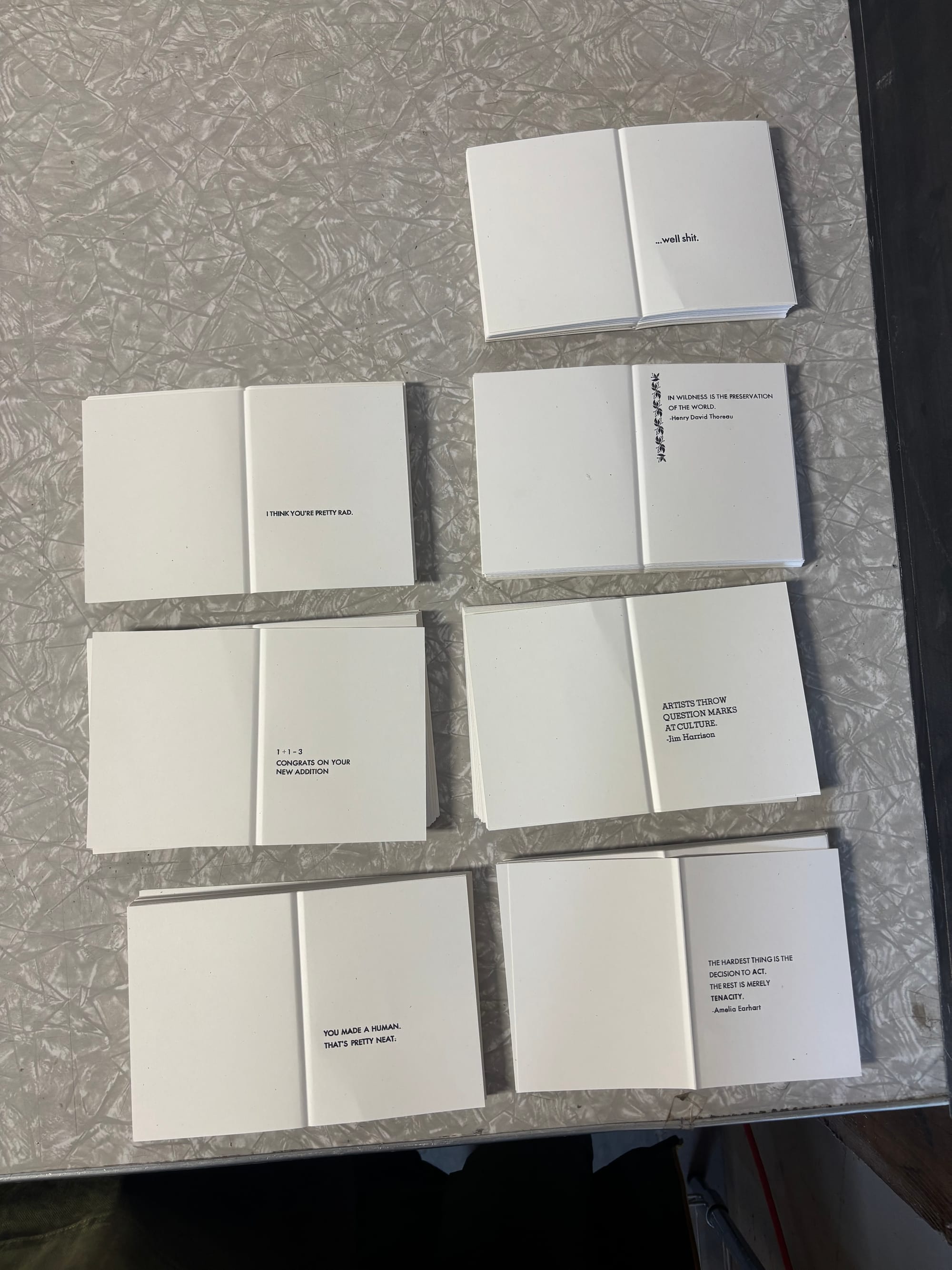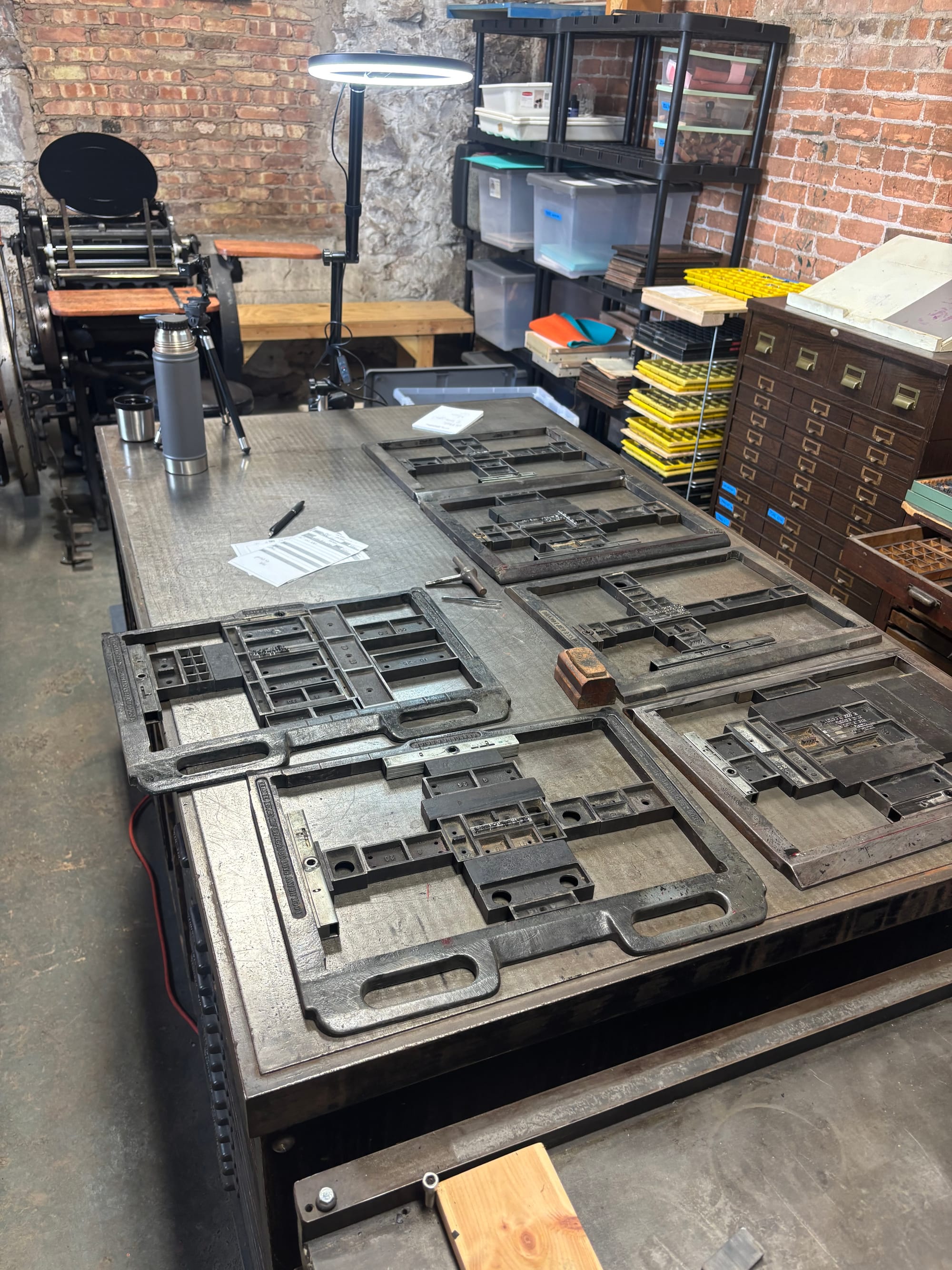 I started working on building up some card inventory over the last couple weeks, which started with cutting paper (I really, really need a proper paper cutter) and then folding them on the press. The folding process consists of locking creasing rule into a form, putting that on the press, and then laying creasing matrix onto the platen. Creasing rule is basically a thin metal bar that pushes the paper into the groove of the matrix, creating a nice crease so the card can then be folded. Here's what that looks like: