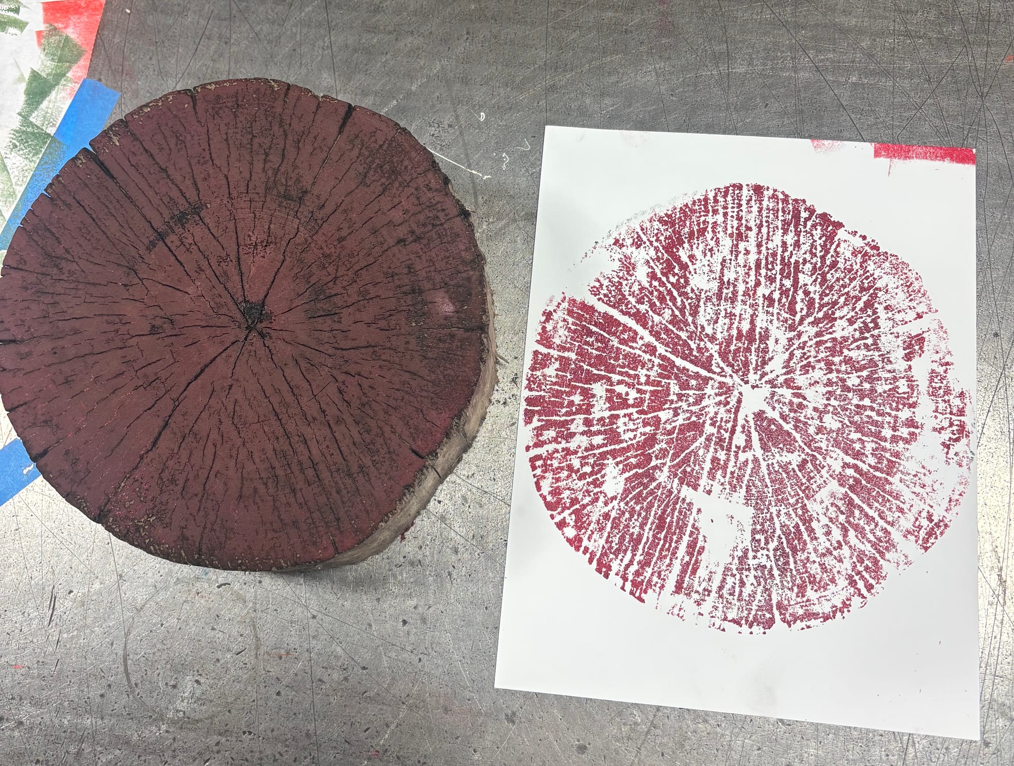 My time in the studio has been more focused on cleaning up from painting and moving the last of my office over, but I did take some time to mess around with a tree ring print.